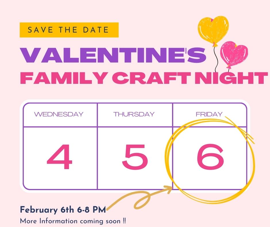 Save the Date! More info coming soon from the PTO! [Friday, Jan 16 at 7:47 AM]TO REGISTER FOR THE FAMILY CRAFT NIGHT PLEASE REGISTER HERE : https://forms.gle/xdFLjhnAHaFgN1v89