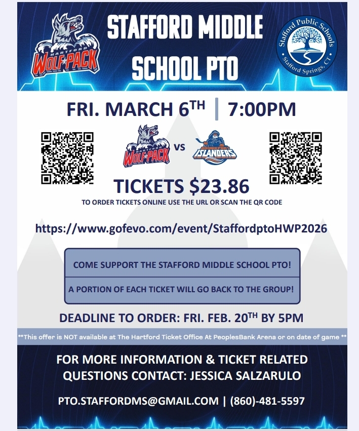 Family Night at the WolfPack. Stafford Middle School PTO will be selling tickets to the March 6th game. In addition to the game, we are also selling raffle tickets for a chance to win a Zamboni ...